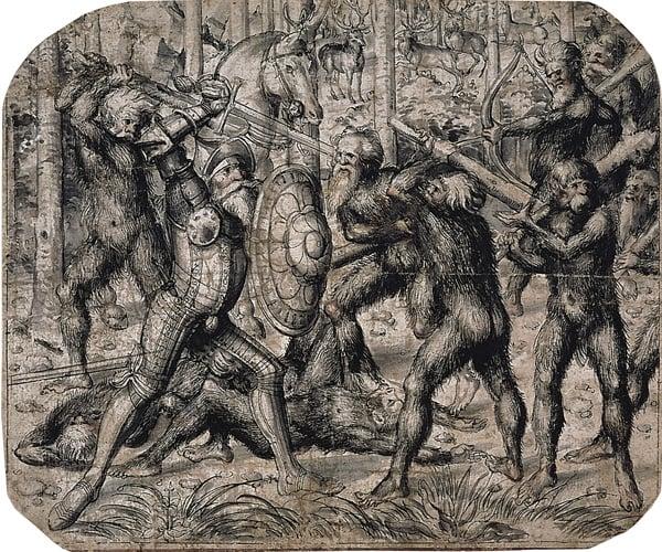 An armoured knight, perhaps Hercules, fighting wild men in a wood, with deer in the background. This is one of 111 drawings bequeathed to the British Museum by Rosi Schilling in 1997. The majority of this collection of drawings formed by Dr Edmund Schilling was bequeathed to the British Museum through the Art Fund by his widow, Mrs Rosi Schilling, in 1993. Schilling was a former curator of the Stadelsches Kunstinstitut in Frankfurt, who emigrated to England in 1937. He was one of the few acknowledged specialists in this country on German graphic art, and built up his collection during the 1940s and 1950s in London when, Northern drawings were unfashionable and could be bought relatively inexpensively. His collection included drawings by major artists such as Hans Baldung and Lucas Cranach.