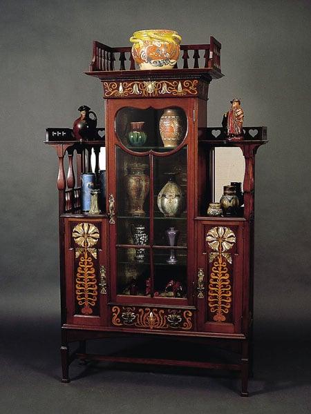 Stepped outline, inlaid all over in mother-of-pearl and light woods with stylised flowers and butterflies, enclosed by a bar glazed panel door, over a drawer flanked by a pair of mirrored opend sections, over a pair of shaped doors.