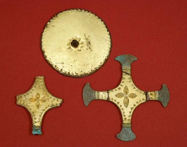 An assemblage of 34 items from the cemetery and a further 4 items from the site. It includes some finds of particular rarity and importance: 1) Paired cruciform harness strap-mounts are of great regional interest as there is a remarkable lack of horse graves from this period in Norfolk; 2) Shield boss mount is virtually unique and the quality of the surviving gilding underscores the prestige of the original Snetterton shield; 3) Pair of equal-arm brooches. The brooches show how localised styles of jewellery were appearing and can be compared to find-types like the horse harness fittings which became associated with an emerging elite.