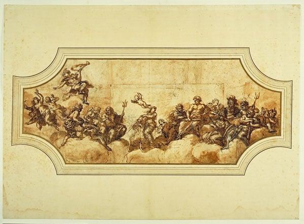 An early preparatory study for the ceiling fresco in the gallery of the Palazzo Pamphili (Piazza Navona), Rome. The frescos illustrate stories from the Aeneid (the Pamphili family claimed descent from the Aeneas). The central compartment represents the Apotheosis of Aeneas, with Jupiter looking towards Venus who points to the left and Hercules at the far right turning towards them.