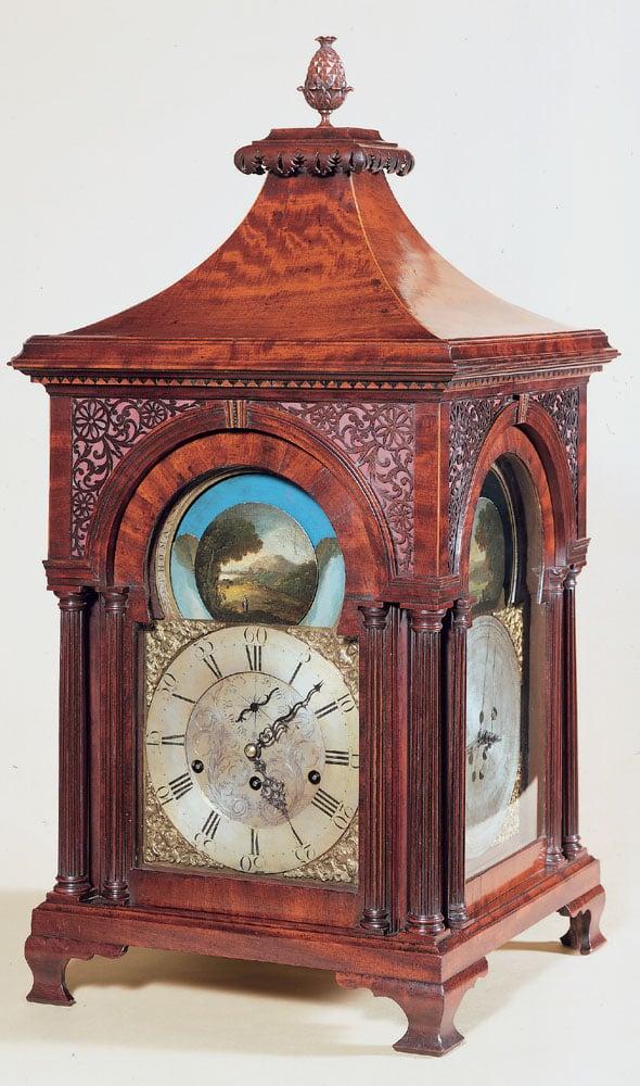 The clock was made in the Liverpool area at the height of the area's international importance as a centre of horological expertise. This clock shows the movement of the sun and moon, planets and stars, and is in full working order.