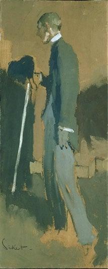 Sickert's portrait of Aubrey Beardsley was inspired by an incident which took place at the unveiling of a memorial bust of Keats in Hampstead Parish Church in July 1894. After the service Beardsley was seen to break away and make his way across the churchyard alone. He was described as 'a slender, gaunt young man hurrying across the graveyard stumbling and lurching awkwardly. This stooping, dandified, loose-limbed, lank figure, immaculately dressed in black cutaway coat .... took off his hat to some lady who called to him, showing his tortoiseshell-coloured hair, smoothed down and plastered over his forehead in a quiff almost to his eyes. He stooped and stumbled so much that he was mistakenly judged shortsighted - in fact he was fighting for breath'. This description very closely fits Sickert's painting, down to the outlines of tombstones in the background of the picture.