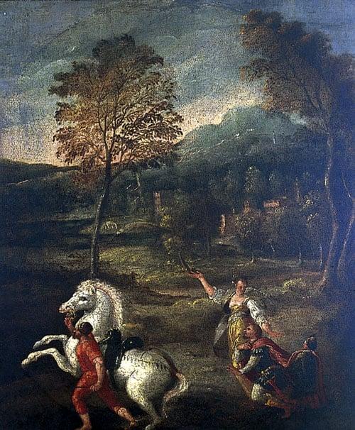 The scene in this painting takes place against a landscape background. A groom leads a horse away from the centre of the painting on the left-hand side of the picture. On the right-hand side of the painting, a kneeling man grasps the knees of a woman, who points up towards the sky. This painting was part of a collection of 117 works belonging to the industrialist and engineer F.D. Lycett Green and bequeathed to York through the Art Fund, in 1955, in recognition of the remarkable efforts made after the Second World War by its curator to transform it into a gallery of international importance.
