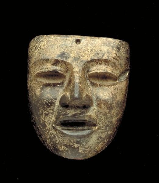 Carved from dark volcanic stone. Suspension hole at each side suggest that it may have been worn as a breast ornament or hung from an idol.