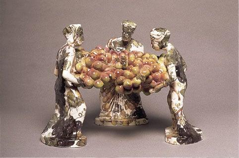 Cream earthenware, slip cast, clear glazed and decorated with French screen-printed slilde-on transfers of fruiting vine; form of three turbanned figures holding between them a garland of grapes; base of one figure inscribed 'Banana Dish'.