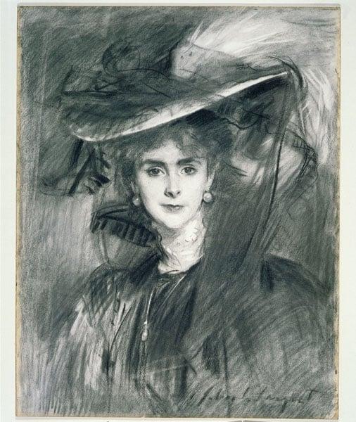 This drawing is a typical example of the artist's drawings of Society beauties of the Edwardian age. The drawing is part of a collection of 7 works presented to the Victoria and Albert Museum, Birmingham and Wakefield Art Gallery. The Honorary CE Stuart Wortley was an art historian and granddaughter of Sir John Millais. She had helped campaign for this drawing to be purchased for the nation in 1925. When the appeal failed, Miss Wortley bought the painting for herself with the intention to gift it to the nation. She presented the work to Birmingham though the Art Fund shortly before her death in 1945.