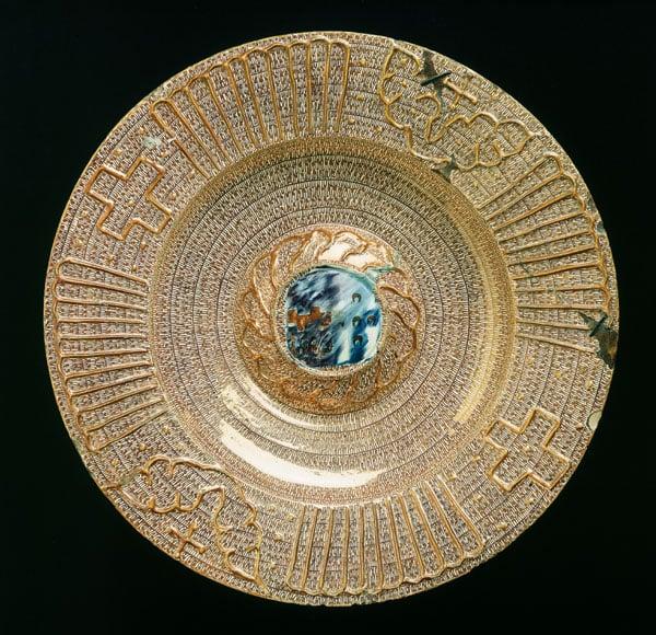 This deep dish has a central boss intended to support a ewer. It is moulded with relief ornament of crosses and radiating panels, and decorated in brilliant metallic lustre with an interlocking pattern of dense miniaturised leaf motifs. In the centre is a shield of arms, Piccolomini impaling Spannocchi (both of Siena). From the end of the 14th century, Italian merchants active in Valencia organised commissions for the rich merchant families of Tuscany.