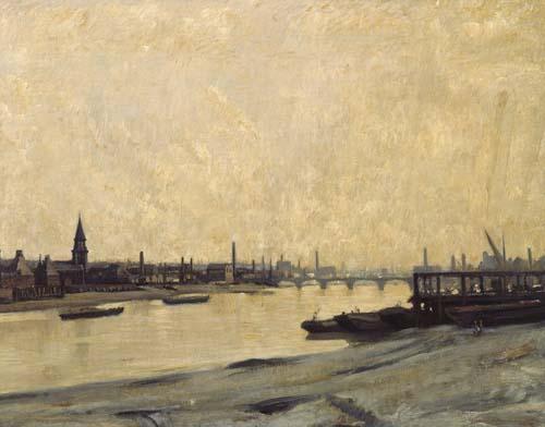 Signed: David Muirhead, 1917.'Battersea Reach, a view of the Thames at low tide.