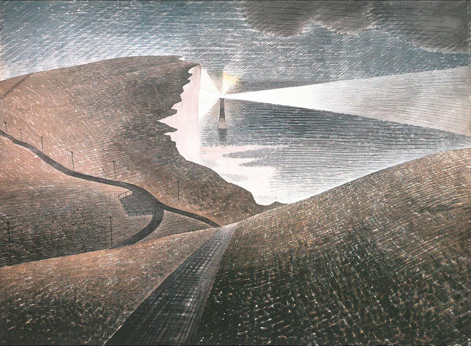 Eric Ravilious is one of Britain’s most celebrated artists, best known for his Modernist watercolours of English landscapes together with his atmospheric prints and book illustrations. Beachy Head is one of his best-known works. Ravilious was born in London but moved to Eastbourne with his parents as a young boy. He trained at Eastbourne School of Art and at the Royal College of Art in London. Beachy Head shows the Sussex coastline in the year the Second World War began, and just before it became transformed by barbed wire and other defences. The artist Michael Rothenstein wrote an account of Ravilious’ working methods for the picture, describing him spending two evenings making colour notes for the scene and returning in the daytime to complete the drawing of the lighthouse and cliffs. The actual painting, with its distinctive dry-brush hatching, was completed from memory. Beachy Head was included in Ravilious’ final solo exhibition in 1939 (he was lost in action in 1942) and was noted by critics as an outstanding work. In his biography, Eric Ravilious: Artist & Designer, the writer Alan Powers describes the painting as one of Ravilious’ ‘most perfect compositions, uncluttered by objects or detail’. Towner Art Gallery, based in the artist’s childhood hometown of Eastbourne, close to Beachy Head, holds one of the largest public collections of Ravilious’ work. The first acquisitions were made in 1936 and the gallery has recently opened a dedicated Ravilious Room with a changing display of his work.