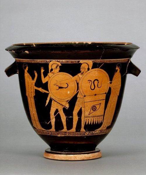 A red figured bell-krater or mixing bowl for wine and water. Bowl with thick rim and two rectangular handles. On one side, two soldiers in full armour, on other two youthful revellers dancing to flute-girl.