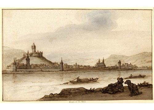 The town is seen across the river. A castle on a mound is to the left; in the foreground on the right a man reclines, with a large dog beside him. Two boats are on the river.