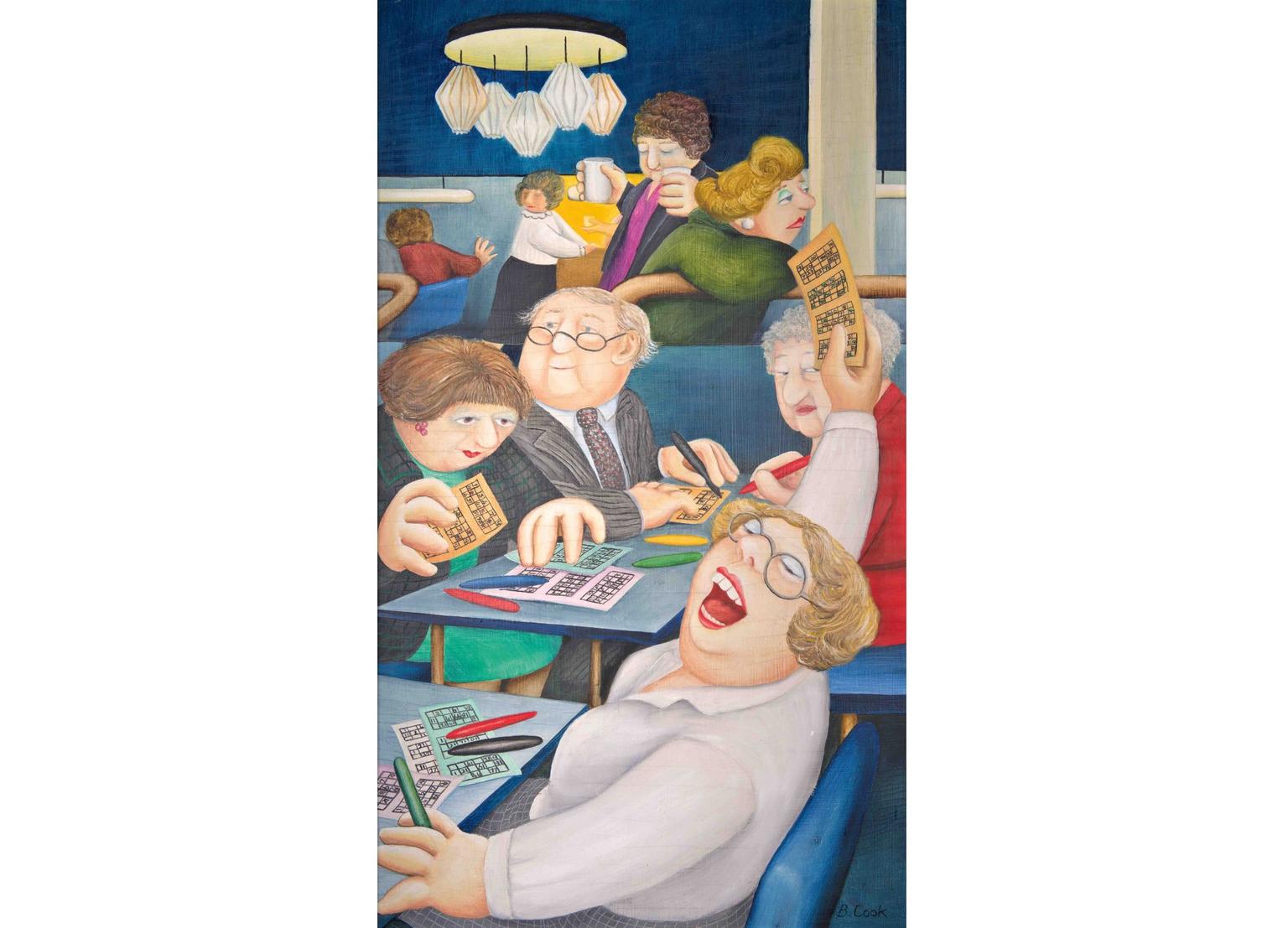 Beryl Cook’s painting Bingo shows a woman exuberantly calling out her winning card. She is seen holding a green pen and waving her full house in the air while neighbouring players look on. Mugs of tea are served at a counter in the background.