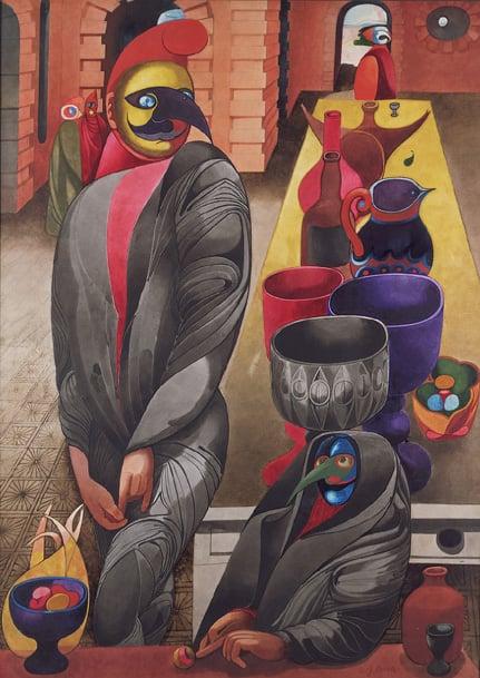 Burra was interested in plays, films and fiction that were strong in observation of human behaviour and set in interiors heavy with atmosphere. In this work, the steeply-raked floor, deep recession and grand architecture are all consistent with these interests. They accentuate the physical and psychological proximity of the mysterious foreground figures who, swathed and witch-like, appear to be engaged in some sinister ritual.