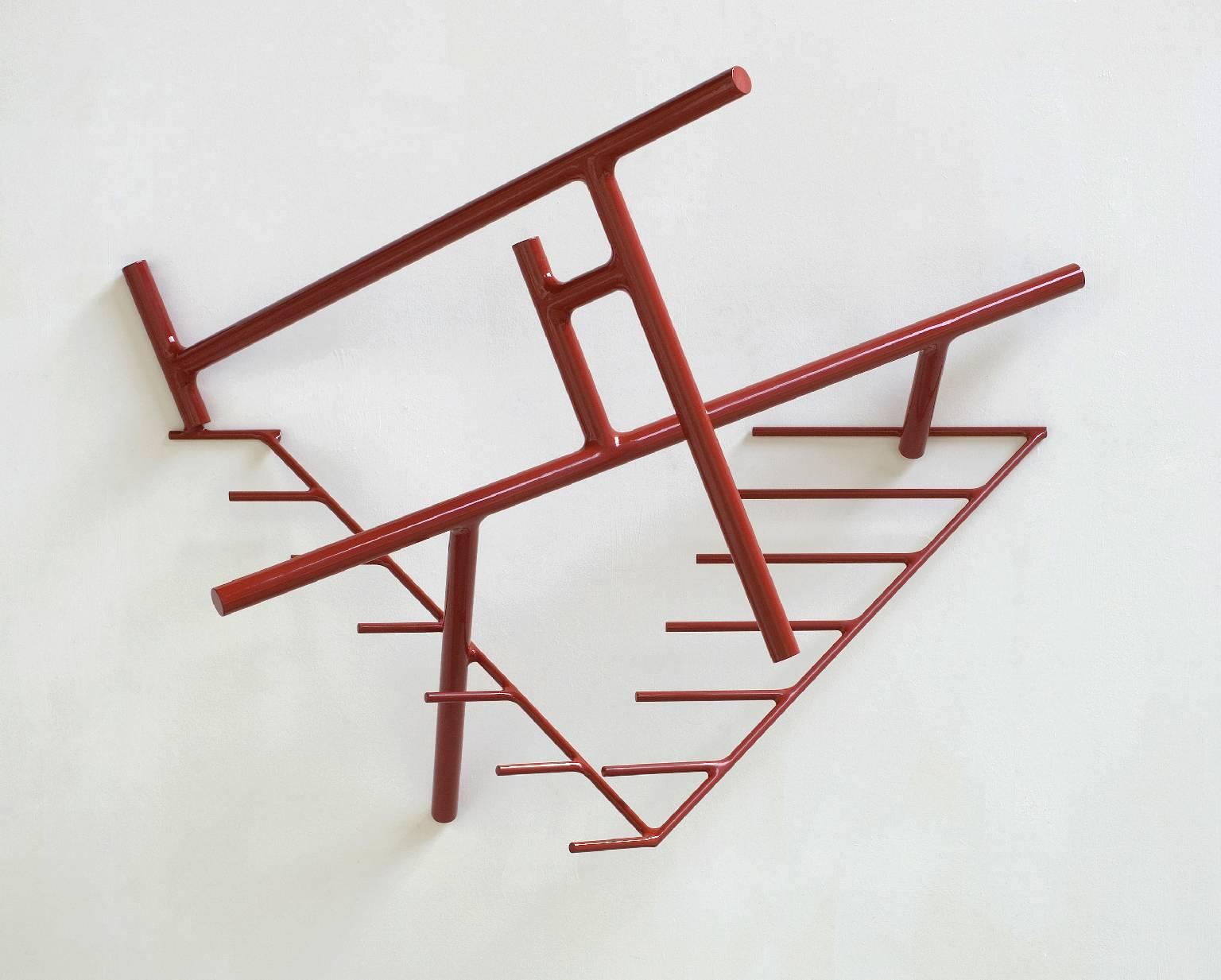 From 1970 until the early 1980s, Hall produced a series of wall-mounted tubular aluminium sculptures. These relief works project into space and use the wall as a backdrop for their shadows.