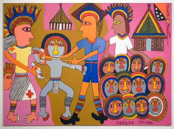 Kauage was one of the founding figures of modern art in the Pacific, and remains to date the most internationally-celebrated Papua New Guinean artist to have worked in modern media. The painting depicts the artistÂ’s own resistance to an injection while at primary school. In one sense the experience is universal, in another what is depicted is the encounter between Australian medical staff and a group of Melanesian children of the first and last generation of Highlanders subject to a brief period of colonial administration. Kauage did not see his work as a vehicle for the representation of customary culture - but more interestingly envisaged diverse events from a Highlands aesthetic perspective.
