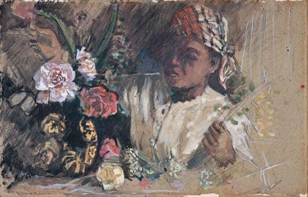 Half-length portrait of woman arranging a vase of colourful flowers. Likely to have been painted in early1870, at which time Bazille had engaged 'une négresse superbe' as a model for three paintings which preoccupied him at the time: two of these works are in the Musée Fabre, Montpelier and the other in the National Gallery, Washington. This composition is closely related to the work of the same title at the Musée Fabre. He referred to his paintings on this theme simply as 'les fleurs', and seems to use the black model as a foil to the exuberance of the peonies and other flowers. Like his friends Renoir and Monet, and other late Impressionists, Bazille drew his subjects from modern life, rather than treat the historical subject-matter favoured by academic tradition.