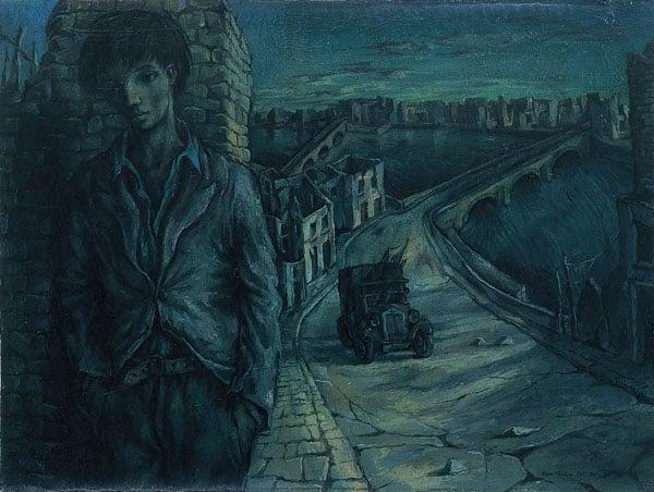 A nocturnal scene depicting a three quarter length self portrait against a background of a river with two bridges, a car and bomb damaged buildings.