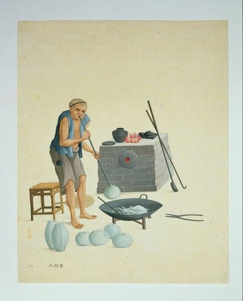 The drawing provides rare visual documentation of the glass blowing process in China and was made for the western market. It almost certainly originated from one of the many workshops in Canton and is a good example of pre-Opium War watercolours from China. It depicts a craftsman, equipped with only a few basic tools, blowing a glass vase beside a small coal-fired furnace resembling a domestic oven. Cullet, or recycled glass, is melting in a wok-shaped pan. Paintings of such subjects have a long history and wide distribution in Asia, and adaptation to western taste, seen here in the modelling of the craftsman's body and the cast shadows, must have begun soon after the arrival of Europeans in eastern waters.