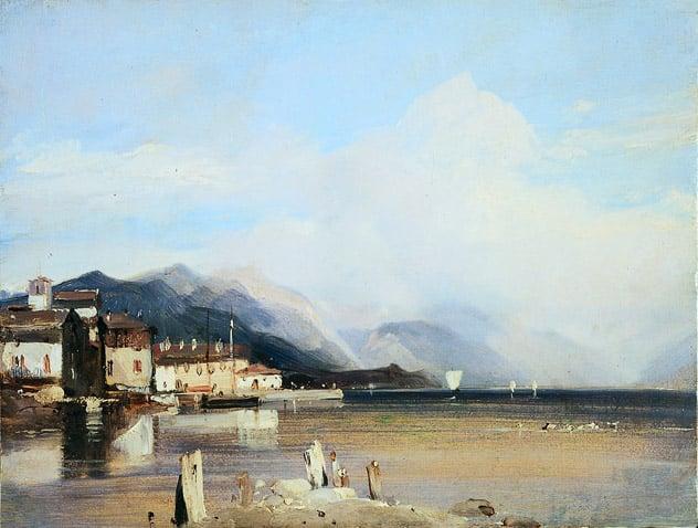 This vivid and elegant sketch of a lake scene with mountains in the background is one of several made by Bonington in the course of his tour of Italy in 1826. With all the freshness, alertness and brilliance of a youthful work, Bonington firmly anticipates the discoveries of the Impressionists. The paint has been applied to a light ground; all presented as pure colour. Much of the water is left with only the slightest glaze, thus reflecting the light from the sky. The strong accents stay proud of the surface, establishing the structure of the houses, the campanile, the pier and customs post, and the foreground shoreline with its several wooden piles.
