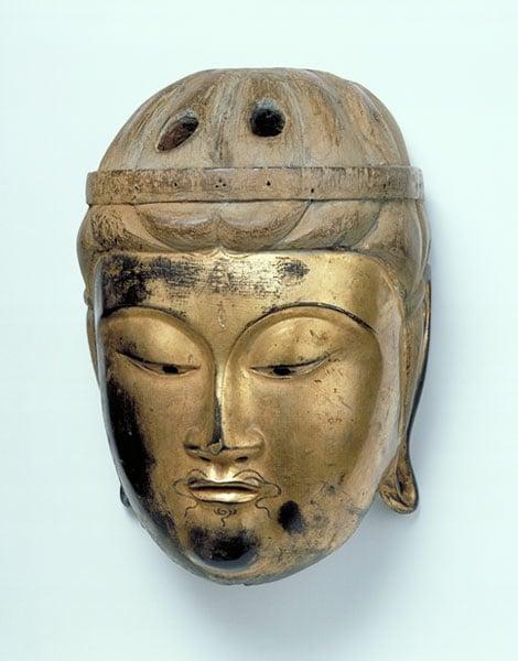 This wood-carving bears details painted in black. A variety of masks, both naturalistic and grotesque, were produced in Japan from the Tempyo period onwards, for the purpose of dance, drama, and religious ritual. This example is of a type made for use in the ceremonies of the Gyodo ritual, when prominent Buddhist deities were paraded in procession. Their sculptural and surface treatment compares closely in style with that of the major wooden statuary produced for worship in the temples, and they are probably the work of the same hands. The noble dignity and calm compassion expressed by the mask embody the highest traditions of the great age of Japanese sculpture, ranking it a major work of art.