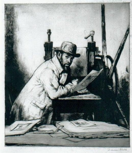 Francis Dodd was a painter and etcher mainly of portraits and architectural subjects. He studied at Glasgow School of Art alongside Muirhead Bone, whose sister he married, and with whom he formed a lifelong friendship. This drypoint is the finest portrait of Muirhead Bone, of whose etched work the Hunterian Art Gallery has a significant collection, and represents one of Dodd's outstanding portraits.