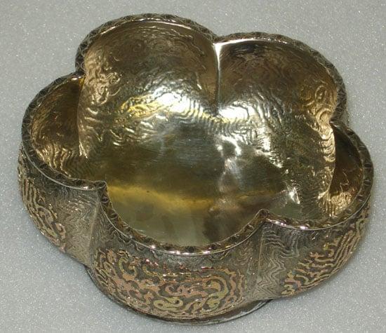 This bowl has a deliberate asymmetrical lobed shape and is decorated with an abstracted trailing ornament inspired by Japanese metalwork. It is an example of Smith changing his style late in life to keep up with the latest fashion in metalwork.