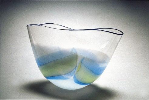 White glass shading to clear, blown with pale blue and yellow panels (appearing green) and dark blue trailing round the rim, inscribed on the base 'Annette Meech 1987' and 'The Glasshouse 1987'.