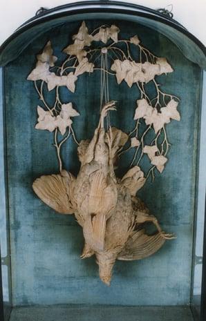A delicate wood carving, mounted on a velvet covered backboard and in a glazed case.