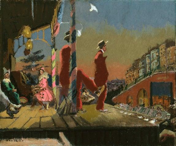 Sickert suddenly felt he wanted to paint the performance of a holiday theatre troupe called The Brighton Pierrots which he saw on the beach at Brighton in 1915. He went out to watch them every evening for five weeks. Using these drawings he made up a design showing the act under way, with some actors looking on while others performed. They are partly hidden behind the struts of the canopy, and some are cut off by the edge of the painting. There is an extraordinary loneliness in Sickert's later paintings, as if he were looking at a world far away which he could no longer fully join. Extract from an article in the 1995 Art Fund Review by David Frasier Jenkins.