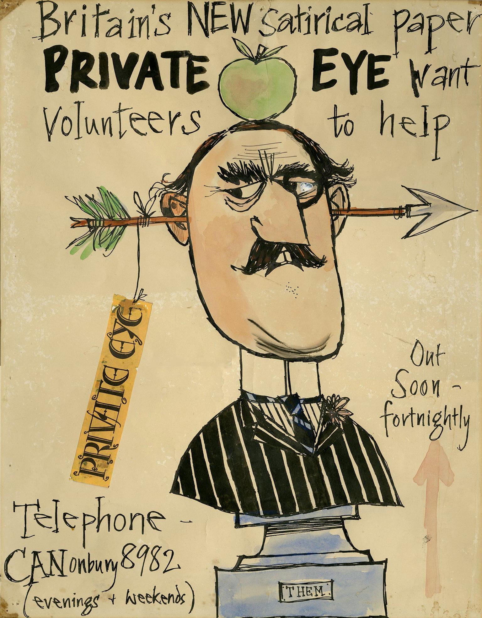 Willie Rushton was a leading figure in the satire boom of the 1960s. This poster calls for volunteers to support the launch of Private Eye, which he co-founded, wrote for and contributed cartoons to.