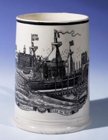 Frog mug. Decorated with a transfer-print of the launch of a ship with the caption 'Britannia Rules the waves'. A cartouche incorporated within the title bears the name of the Union pottery.
