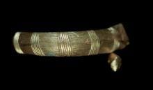 The surviving half of a Bronze age neck ornament in the form of a pointed oval-section bar with surface decoration consisting of 24 alternating panels of closely-set longitudinal and transverse grooves. Believed to be French or Irish.