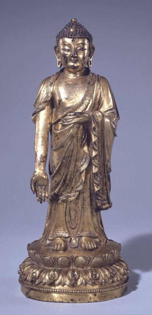 A standing figure of the Buddha on a lotus base with the right hand extended in the vara mudra, expressing charity. Date: the third year of Ch'eng-hua.