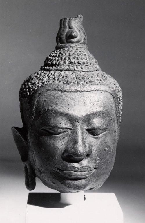 Siamese head showing stylistic blend of the Khmer empire and the new Thai invaders called U-t'ong. The flame shaped ushnisha on the head is typical of Siamese art.