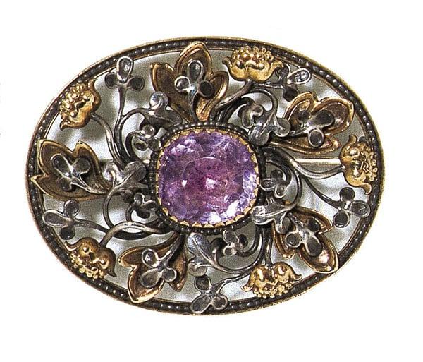 Oval brooch with flower and vine motif in silver and gold. Centre is a large oval amethyst.