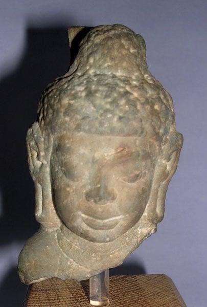 This small example of a Buddhist head is carved in limestone of considerable hardness and the surface is weathered. It shows clearly the stylistic type of the Mon school.