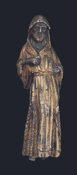Unidentified standing figure priest or apostle or saint. Elongated stance, head covered by hood, tunic belted at waist, flowing drapery is split on the sides to reveal decorative embroidered lining. Right hand in front of chest, left hand broken off.