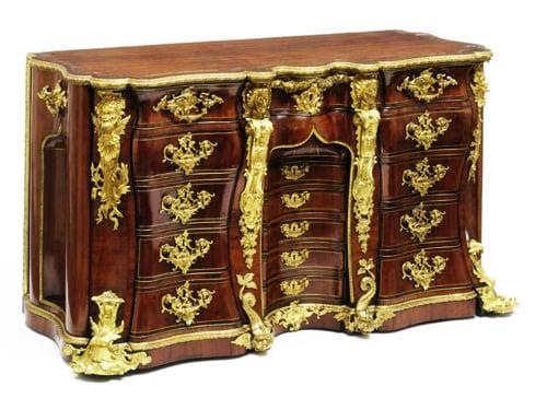 The most imposing feature are the cast, chased and gilt brass mounts. Extremely high quality of cabinetwork - even the drawer-linings are constructed of dark figured mahogany.