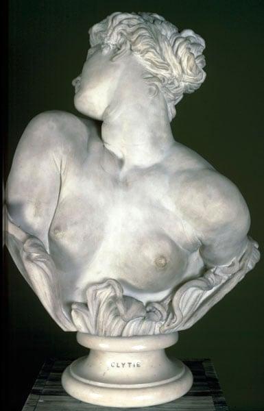 Bust of Clytie turning her head to look at the sun. The calyx of the sunflower, into which she seems to be changing, forms part of the base of the bust. The bust stands on a Greek marble pedestal. Clytie was the daughter of Oceanus and Tethys, and after being deserted by her lover Apollo, she pined away and changed into a sunflower, which still turns its head towards the sun's course, as in pledge of her love.