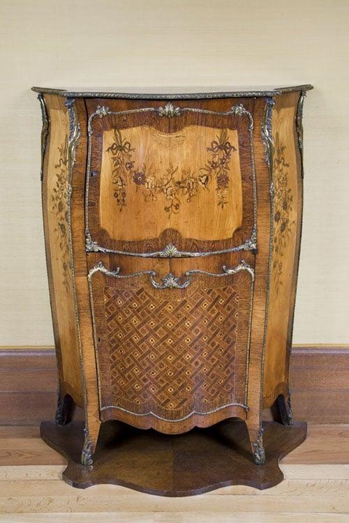 An upright serpentine-front cabinet with two compartments, of a very unusual, perhaps even unique design. Veneered in rosewood and satinwood over a body of mahogany with a figured top of yew.