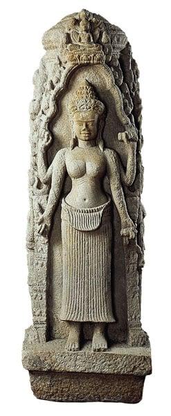 Sculpture depicting standing figures of auspicious and protective Mahayana Buddhist deities on its four faces.