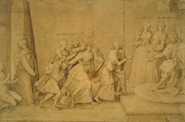 This drawing is the sole surviving classical drawing by Bruegel. It is inspired by a legendary lost picture of the Greek painter Apelles as described by Lucian, the Roman writer of the second century AD and depicts the power of ignorance and deceit to mask the truth. Seated on the right, there is Prince Ptolemeus on his throne, with greatly enlarged ears, surrounded by his female advisers Ignorance and Suspicion. Before him, with a foot on the platform of the throne, is Lyvor (Envy), pointing towards the prince and gesturing for silence. Followed by Insidia (Guile) and Fallacia (Deceit), Calumny stands behind them bearing a torch on the one hand and pulling a child with the other. At the extreme left, Penitencia (Repentance) gazes back shredding tears of shame towards the Truth.