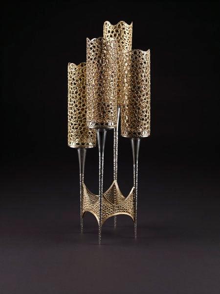 This candelabrum is an excellent example of DevlinÂ’s mature work, exploiting his trademark use of contrasting textures and colours, particularly in the elaborate tooled and heavily gilt openwork of the candle cages. Birmingham Museum and Art Gallery has been building a significant collection of modern and contemporary silver and metalwork since 1997.However, while there is great strength in the pieces from the 1990s onwards, the 1970s and 1980s are less well represented. This gift greatly increases the museumÂ’s representation of post-war silver. The Devlin candelabrum can be shown alongside works in the cityÂ’s Civic Plate collection by his near-contemporaries at the Royal College, Eric Clements, Robert Welch and Gerald Benney. Extract of an article in the 2007 Art Fund Review written by Martin Ellis.