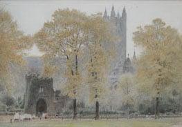 Despite his Pre-Raphaelite beginnings, Goodwin managed to follow an independant path as he preferred soft to bright colours and did not like working from nature. He worked mainly in watercolour, using thick body colour often combined with pen to create effects which are instantly recognisable. The drawing shows Canterbury Cathedral from the Green Court in the King's School.