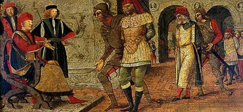 The scene in this paiting takes place in front of an architectural background. Two prisoners are led by soldiers to a seated judge. The judge is surrounded by attendants and more prisoners and figures can be seen in the distance to the right. This painting was part of a collection of 117 works belonging to the industrialist and engineer F.D. Lycett Green and bequeathed to York through the Art Fund, in 1955, in recognition of the remarkable efforts made after the Second World War by its curator to transform it into a gallery of international importance.