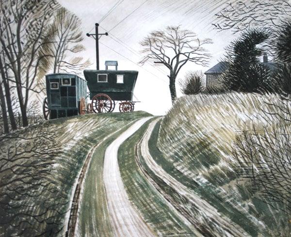Ravilious bought these two caravans which were originally used as fever wagons in the Boer War and had them towed to a site on the South Downs. Ravilious and his wife lived in one caravan and used the other as a studio, both of which were concealed in bushes to avoid upsetting the landowner. This watercolour is a good example of Ravilious ‘mark-making’ and dry brushwork which is a reflection of the season. There is a sense of modernity about the picture and the abstract shapes make this stylistically unlike the other work in the Fry collection.