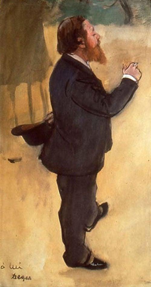 Portrait sketch of Pellegrini (the Ape 1839-89) in a comic pose. Pellegrini was a well-known portrait caricaturist working in London. He had painted Degas's portrait in London and this work was done in return. Signed: a lui Degas. On loan from the Tate.
