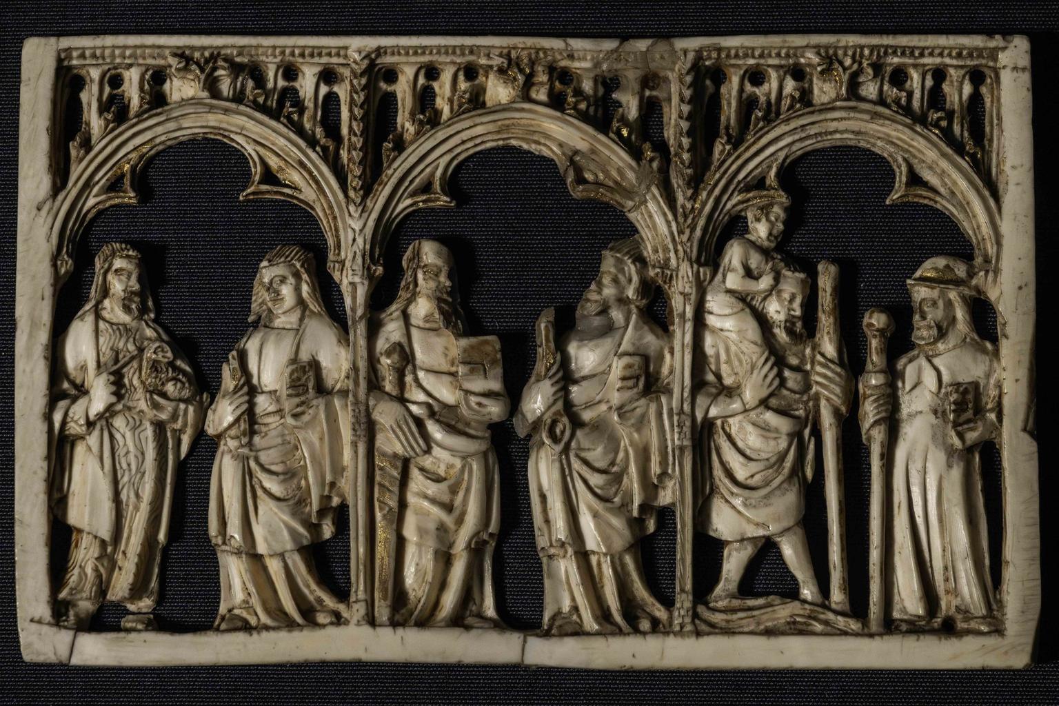 This delicately carved ivory panel shows six saints framed by an arcade of Gothic arches.