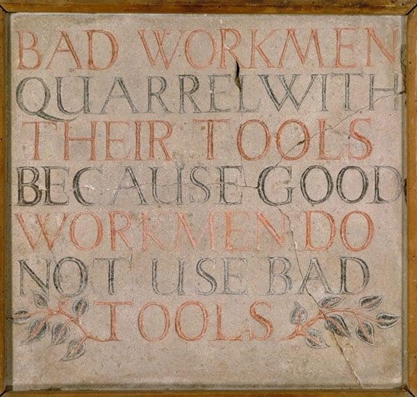 Tablet carved with the inscription; 'BAD WORKMEN QUARREL WITH THEIR TOOLS BECAUSE GOOD WORKMEN DO NOT USE BAD TOOLS'. Made in Gill workshops, possibly by student of Gill.