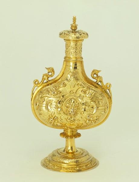 Casting (rosewater) bottle. Body chased and embossed with strapwork cartouches and snails with fruit pendants. Band of die-stamped strapwork round neck. An example of Elizabethan court goldsmiths work.